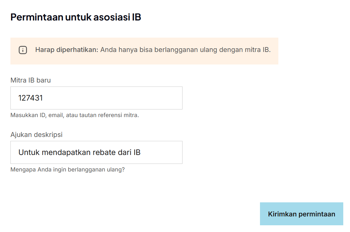 - Pada kolom "Mitra IB baru" masukkan kode IB kami yaitu 127431