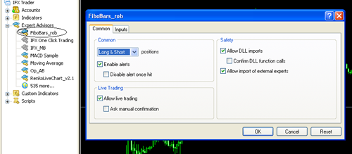 3. Kemudian pada klik tanda “+” atau namanya expand, maka akan uncul Expert advisor yang anda copy tadi, misalnya pada contoh ini kita akan memasang EA “fibobar_rob”, drag file tersebut ke dalam chart, maka akan muncul dialog box seperti berikut: